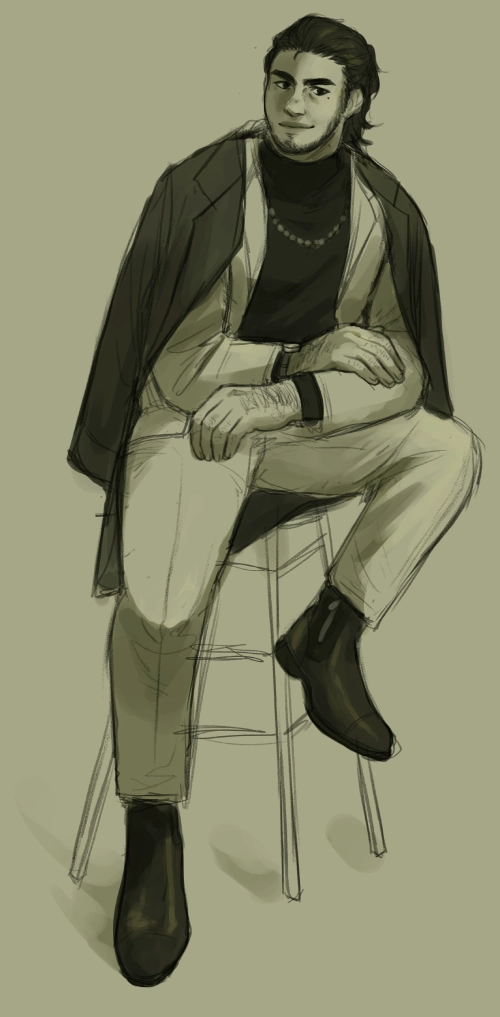 A monochrome sketch of Bruno sitting on a stool with his left foot propped up against the footrest. His arms are crossed and resting on his thighs. He wears a black turtleneck and necklace under a white suit. He also wears a dark coat draped over his shoulders and leather ankle boots.