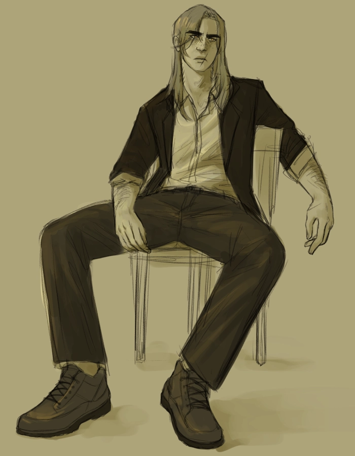 A monochrome sketch of Ian sitting on a chair with his left arm draped over the back. His posture is slouched, and he's sitting with his legs spread. He wears a white shirt, dark blazer and slacks, and leather lace-up shoes.